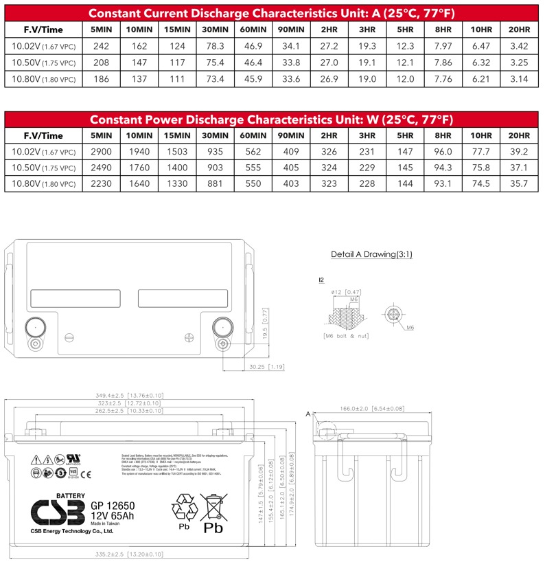 | Model Number | CSB GP12650 12V 65Ah | Battery | 12V 65Ah |